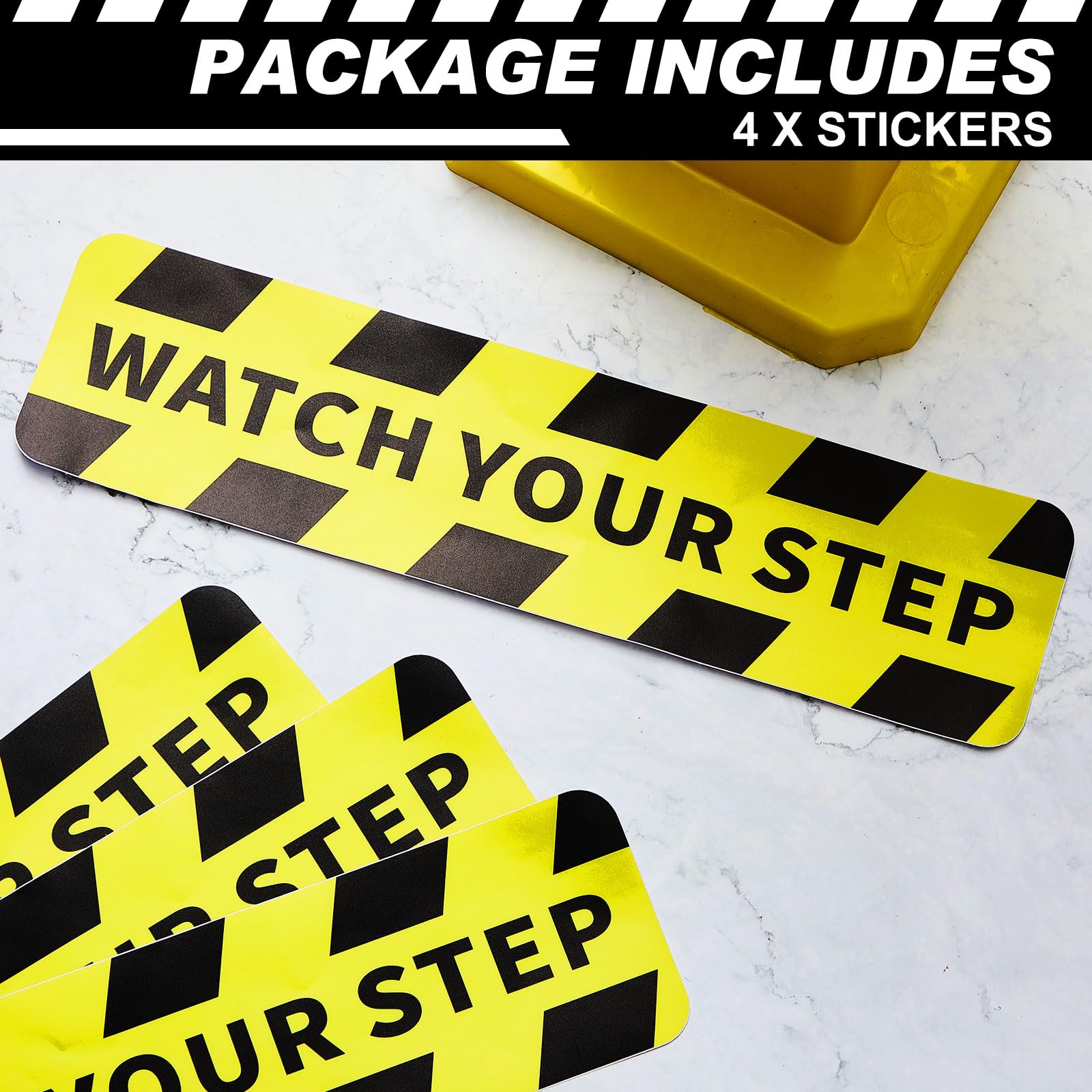 Fulmoon 4 Pcs 20 x 5 Inch Watch Your Step Stickers Tape, Watch Your Step Sign, Self Adhesive Anti Slip Water Resistance Decals Caution Vinyl Decal for Safety Indoor Outdoor Workplace Wet Floor