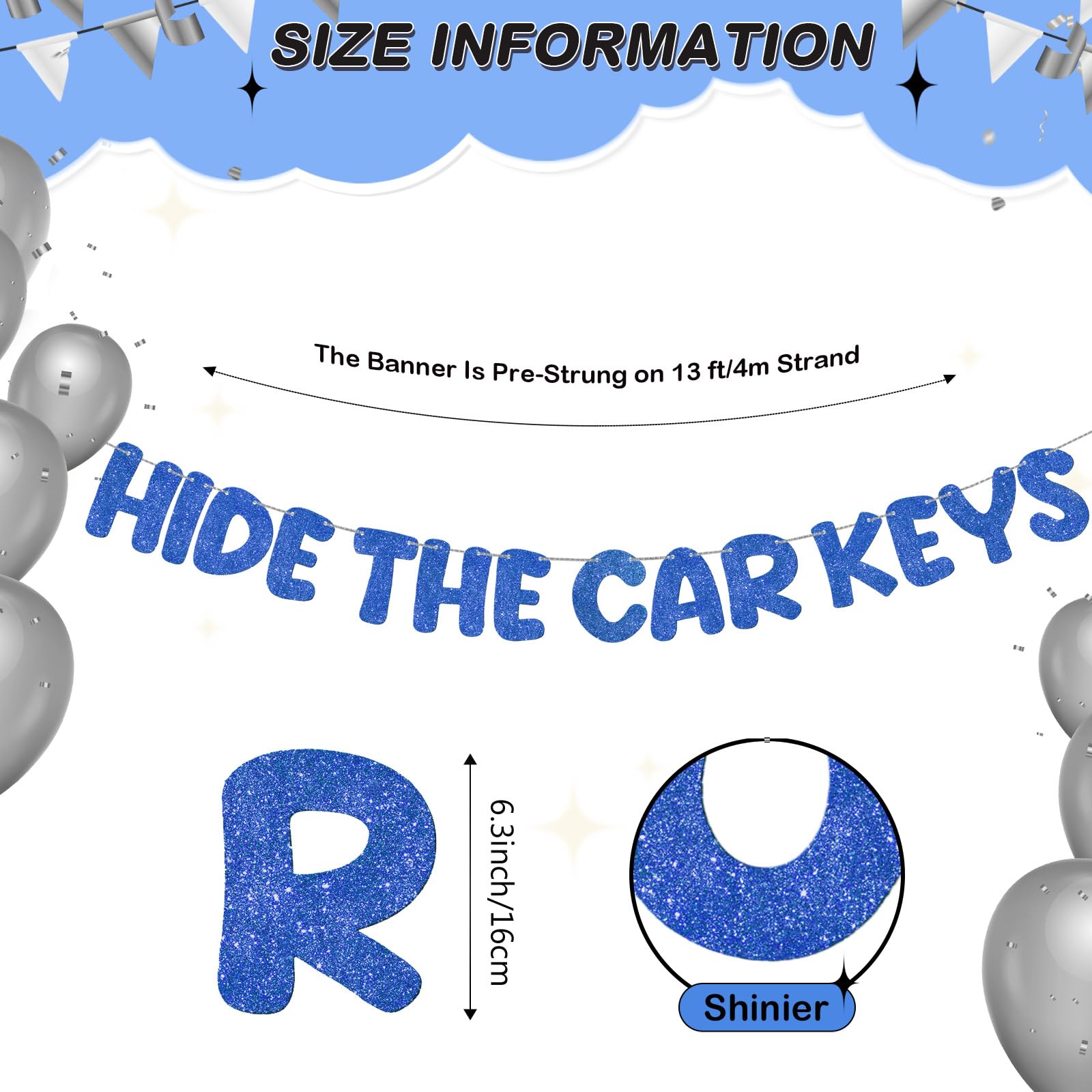 - Glitter Style: add a touch of glitz to your party with this birthday banner funny; With shimmering letters spelling out [Hide The Car Keys], it adds a splash of humor and quirky touch to your parties; The glittering finish on the banner illuminates under light, adding sparkle to your venue